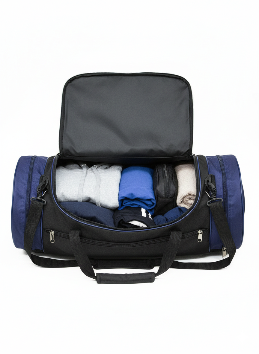 Сумка спортивная производство Россия фабрика Lootbag. Сумка дорожная имеет обьем 50 литров на 10 килограмм вещей и одно основное отделение на 45 литров и размерами 50 см. на 32 см. на 27 см, два небольших кармана спереди и два больших боковых кармана шириной по 7,5 см каждый на замках молния. Две ручки для ношения в руке длиной 17 см, крепко вшиты и надежно закреплены, длинный регулируемый плечевой ремень длинной 100 см. из очень качественной и крепкой тесьмы может пристегиваться к сумке на кольцах и карабинах из крепкого и надежного АБС пластика. Дно укреплено специальной прокладкой. Цвет черный с синими вставками.
